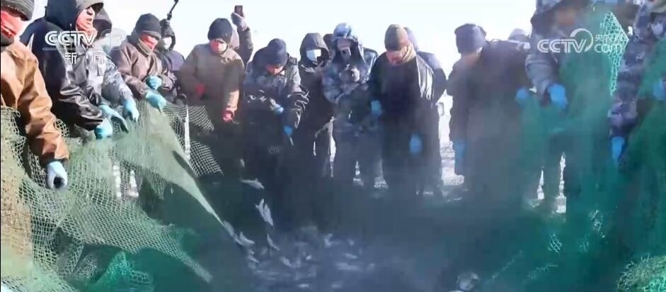 在克什克騰旗達里湖現(xiàn)場,人工鑿冰、冰下走網(wǎng),冬捕隊員在作業(yè)時選用5公分網(wǎng)眼,這樣捕魚時就能漏掉小魚。馬拉絞盤將大網(wǎng)拖拽出網(wǎng)口,滿載魚兒的漁網(wǎng)慢慢地從湖水中出來,游客們感受豐收的喜悅。