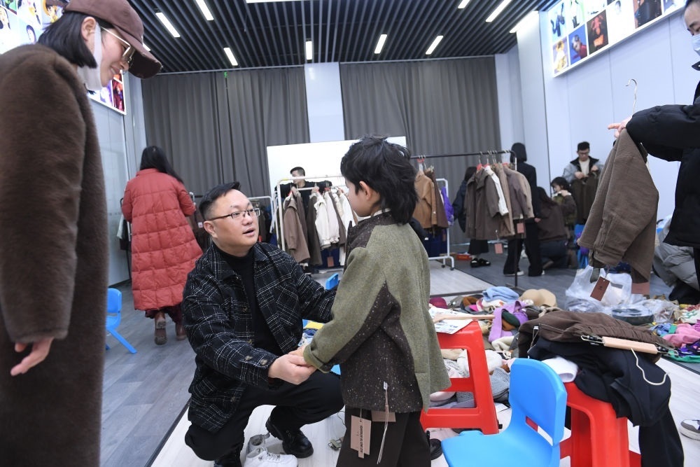 2024年1月17日,在位于浙江省湖州市織里鎮(zhèn)的萬(wàn)順?lè)椆煞萦邢薰?,工作人員(前左二)在品牌的2024秋季新品審版會(huì)后臺(tái)和小模特交流??椑镦?zhèn)是中國(guó)最大的童裝產(chǎn)業(yè)集群地,聚集著1.4萬(wàn)家童裝企業(yè)。新華社記者 翁忻旸 攝