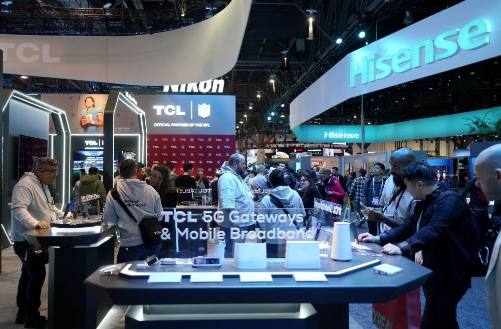 2024年1月11日,人們?cè)诿绹?guó)拉斯維加斯消費(fèi)電子展上參觀TCL公司(左)和海信公司(右)展臺(tái)。新華社記者 吳曉凌 攝