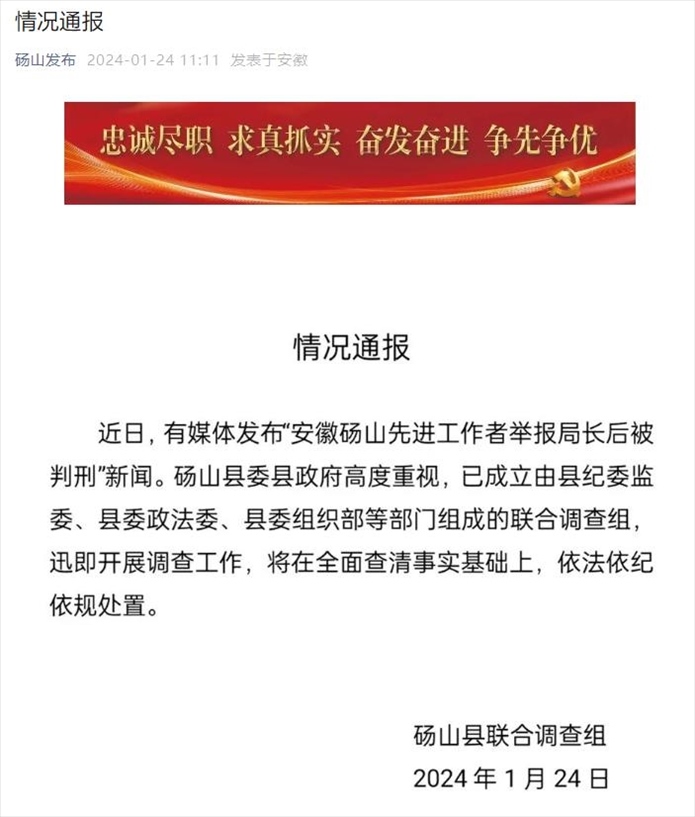 ·安徽碭山先進(jìn)工作者舉報局長后被判刑?碭山縣回應(yīng):已成立聯(lián)合調(diào)查組迅即開展調(diào)查工作,將在全面查清事實(shí)基礎(chǔ)上,依法依紀(jì)依規(guī)處置。