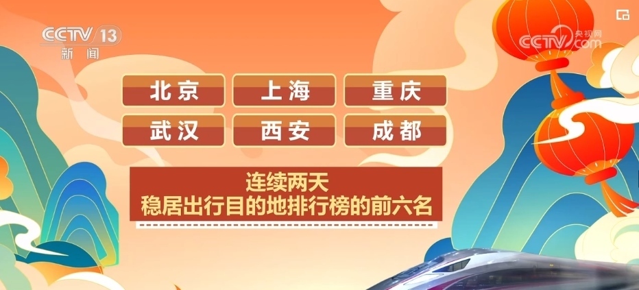 從12306的售票情況看,高峰期1秒鐘就能售出1000多張車票。北京、上海、重慶、武漢、西安、成都連續(xù)兩天穩(wěn)居出行目的地排行榜的前六名。