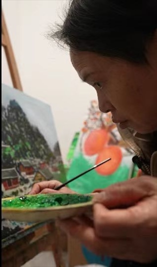 一支畫筆,一盒顏料,一張畫布,這幾乎是雙溪鎮(zhèn)能提供給王柳云的全部。那段時間,她走街串巷,畫山,畫水,畫民居,也“畫”心。憑著一種隱約的天賦和純天然的熱愛,大概過了三個月,王柳云已經能大批量地賣畫。