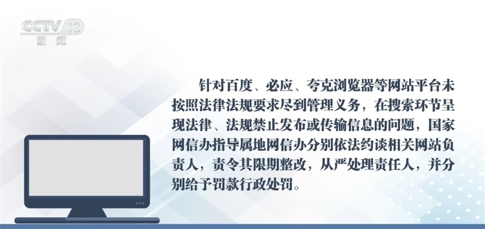 針對百度、必應(yīng)、夸克瀏覽器等網(wǎng)站平臺未按照法律法規(guī)要求盡到管理義務(wù),在搜索環(huán)節(jié)呈現(xiàn)法律、法規(guī)禁止發(fā)布或傳輸?shù)男畔栴},國家網(wǎng)信辦指導(dǎo)屬地網(wǎng)信辦分別依法約談相關(guān)網(wǎng)站負(fù)責(zé)人,責(zé)令其限期整改,從嚴(yán)處理責(zé)任人,并分別給予罰款行政處罰。