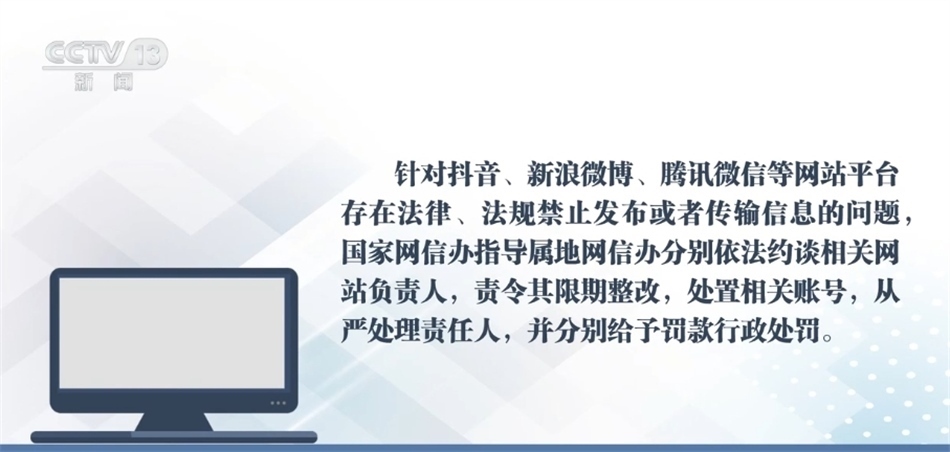 針對抖音、新浪微博、騰訊微信等網(wǎng)站平臺存在法律、法規(guī)禁止發(fā)布或者傳輸信息的問題,國家網(wǎng)信辦指導(dǎo)屬地網(wǎng)信辦分別依法約談相關(guān)網(wǎng)站負(fù)責(zé)人,責(zé)令其限期整改,處置相關(guān)賬號,從嚴(yán)處理責(zé)任人,并分別給予罰款行政處罰。