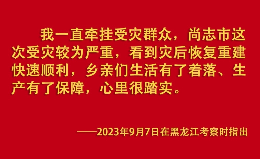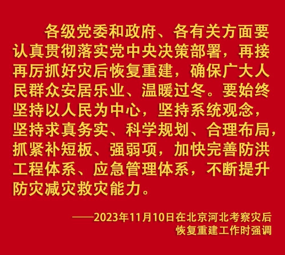 2023年汛期以來,我國華北、東北等地出現(xiàn)極端降雨,引發(fā)洪澇和地質災害。習近平一直牽掛著受災群眾,高度重視防汛抗洪救災和災后恢復重建工作,多次作出重要指示批示,要求有關地方和部門全力保障人民群眾生命財產(chǎn)安全,盡快恢復災區(qū)正常生產(chǎn)生活秩序。2023年9月上旬,習近平前往黑龍江尚志市看望慰問受災群眾;11月,北方入冬之際,習近平又來到北京、河北受災較重的相關地區(qū),看望慰問受災群眾,檢查指導災后恢復重建工作。