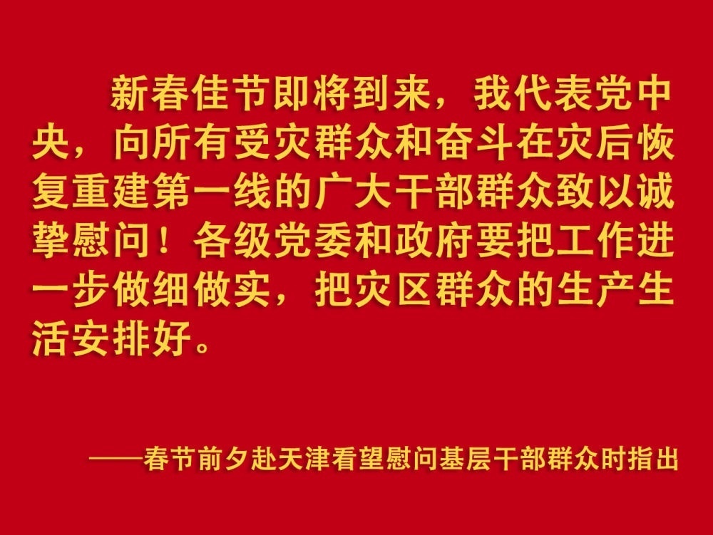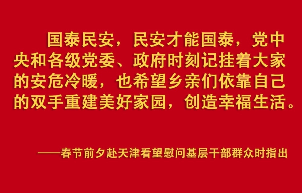春節(jié)前夕,習近平總書記在天津考察調(diào)研,看望慰問基層干部群眾。2月1日上午,他首先來到西青區(qū)辛口鎮(zhèn)第六埠村,實地了解去年洪澇災害后當?shù)剞r(nóng)業(yè)生產(chǎn)恢復等情況,看望受災群眾。