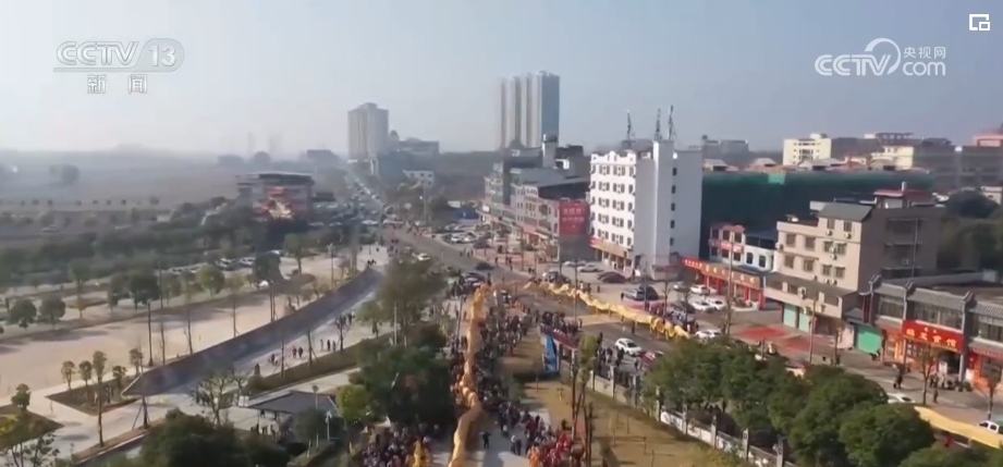 2月10日上午,在廣東韶關(guān)南雄市珠璣古巷,一場盛大的九十九節(jié)龍巡游熱鬧上演。九十九節(jié)龍的龍頭由五種顏色繪制,兩額長著長角、兩邊附有魚鱗片,金光閃閃、色彩鮮艷,龍首龍尾還粘有九十九朵長壽之花。它在珠璣古巷內(nèi)巡游,為父老鄉(xiāng)親祈福,并分別在珠璣牌坊、百姓堂列隊,用龍身擺出“龍年大吉”“天下太平”的新年祝福。