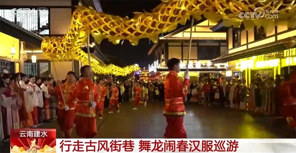 在云南紅河州建水縣紫陶里漢唐街區(qū),一場舞龍鬧春漢服巡游活動拉開了序幕。舞龍隊伍一路閃轉(zhuǎn)騰挪,一條黃色長龍奮力舞動,忽高忽低,飄忽飛逸。身著華美漢服的姑娘行走在古風街巷間,一種古樸幽遠的韻味撲面而來。市民與游客在感受建水年味的同時,也體驗到中華傳統(tǒng)文化之美。