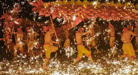 銅梁龍舞是首批國(guó)家級(jí)非物質(zhì)文化遺產(chǎn),被譽(yù)為“中華第一龍”。1500℃的鐵水瞬間在空中炸開,綻放成美麗的煙花雨。