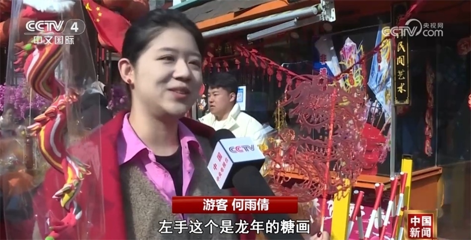 游客何雨倩在接受記者采訪時說:“逛廟會,過大年,今天最大的驚喜就是看到了這么多的非遺項目,我右手這個是龍年的生肖面人,左手這個是龍年的糖畫,特別適合打卡,真是太有年味了?!?/p>