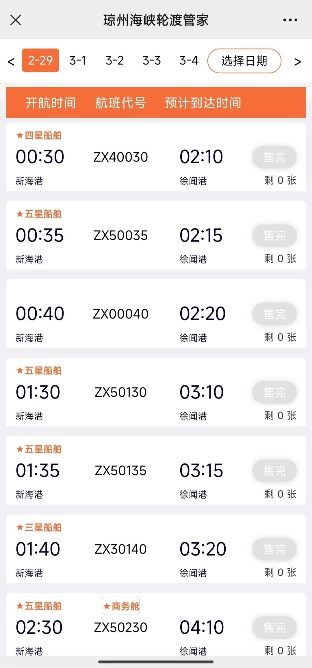 澎湃新聞記者17日上午查詢官方購票平臺“瓊州海峽輪渡管家”發(fā)現(xiàn),實時數(shù)據(jù)顯示,??谛潞8壑列炻劯鄣男履茉窜囕喍善?,2月17日至2月29日均已售罄。