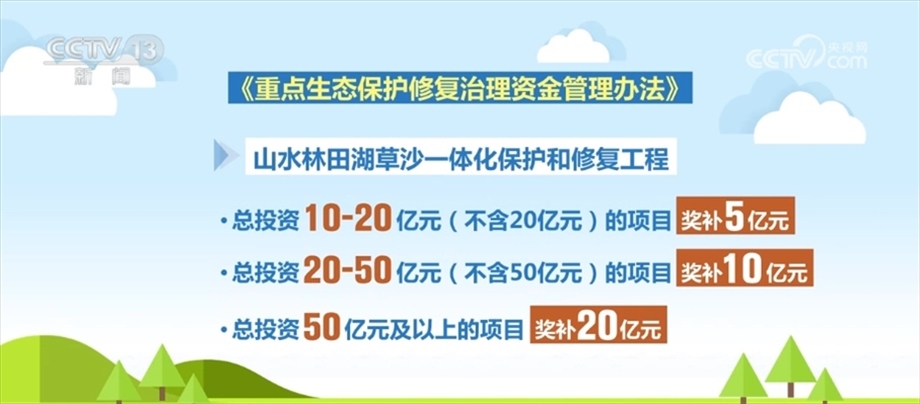 資金具體怎么分配?新辦法指出,山水林田湖草沙一體化保護和修復工程總投資10億元—20億元(不含20億元)的項目獎補5億元;工程總投資20億元—50億元(不含50億元)的項目獎補10億元;工程總投資50億元及以上的項目獎補20億元。歷史遺留廢棄工礦土地整治總投資5億元及以上的項目獎補3億元。