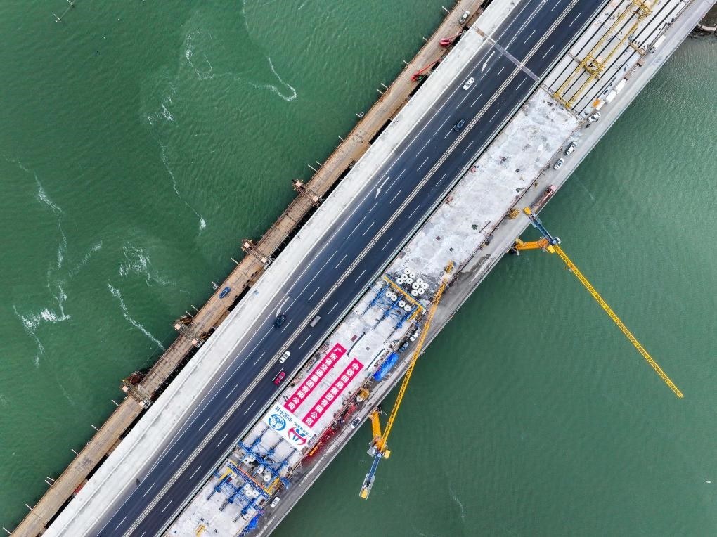這是1月21日拍攝的深汕西高速長(zhǎng)沙灣跨海特大橋(無(wú)人機(jī)照片)。當(dāng)日,中鐵四局承建的深汕西高速改擴(kuò)建項(xiàng)目長(zhǎng)沙灣跨海特大橋左幅主跨合龍。新華社記者 劉大偉 攝