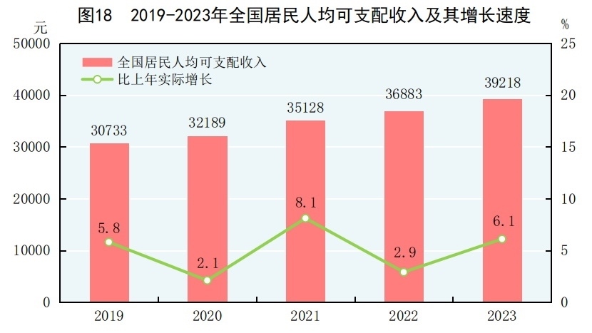 全年全國居民人均可支配收入39218元,比上年增長6.3%,扣除價格因素,實際增長6.1%。全國居民人均可支配收入中位數(shù)[56]33036元,增長5.3%。按常住地分,城鎮(zhèn)居民人均可支配收入51821元,比上年增長5.1%,扣除價格因素,實際增長4.8%。城鎮(zhèn)居民人均可支配收入中位數(shù)47122元,增長4.4%。農(nóng)村居民人均可支配收入21691元,比上年增長7.7%,扣除價格因素,實際增長7.6%。農(nóng)村居民人均可支配收入中位數(shù)18748元,增長5.7%。城鄉(xiāng)居民人均可支配收入比值為2.39,比上年縮小0.06。按全國居民五等份收入分組[57],低收入組人均可支配收入9215元,中間偏下收入組人均可支配收入20442元,中間收入組人均可支配收入32195元,中間偏上收入組人均可支配收入50220元,高收入組人均可支配收入95055元。全國農(nóng)民工人均月收入4780元,比上年增長3.6%。脫貧縣[58]農(nóng)村居民人均可支配收入16396元,比上年增長8.5%,扣除價格因素,實際增長8.4%。