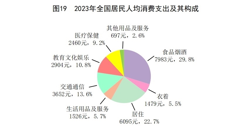 全年全國居民人均消費支出26796元,比上年增長9.2%,扣除價格因素,實際增長9.0%。其中,人均服務(wù)性消費支出[59]12114元,比上年增長14.4%,占居民人均消費支出比重為45.2%。按常住地分,城鎮(zhèn)居民人均消費支出32994元,增長8.6%,扣除價格因素,實際增長8.3%;農(nóng)村居民人均消費支出18175元,增長9.3%,扣除價格因素,實際增長9.2%。全國居民恩格爾系數(shù)為29.8%,其中城鎮(zhèn)為28.8%,農(nóng)村為32.4%。