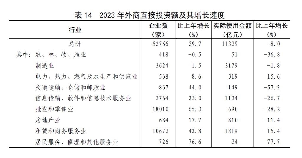 全年外商直接投資新設(shè)立企業(yè)53766家,比上年增長39.7%。實際使用外商直接投資額11339億元,下降8.0%,折1633億美元,下降13.7%。其中,共建“一帶一路”國家對華直接投資(含通過部分自由港對華投資)新設(shè)立企業(yè)13649家,增長82.7%;對華直接投資額1221億元,下降11.4%,折176億美元,下降16.7%。高技術(shù)產(chǎn)業(yè)實際使用外資額4233億元,下降4.9%,折610億美元,下降10.8%。