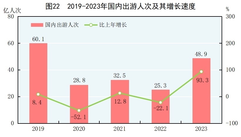 全年國內(nèi)出游48.9億人次,比上年增長93.3%。其中,城鎮(zhèn)居民國內(nèi)出游37.6億人次,增長94.9%;農(nóng)村居民國內(nèi)出游11.3億人次,增長88.5%。國內(nèi)游客出游總花費49133億元,增長140.3%。其中,城鎮(zhèn)居民出游花費41781億元,增長147.5%;農(nóng)村居民出游花費7353億元,增長106.4%。入境游客8203萬人次,其中外國人1378萬人次,香港、澳門和臺灣同胞6824萬人次。入境游客總花費530億美元。國內(nèi)居民出境10096萬人次,其中因私出境9684萬人次,赴港澳臺出境7704萬人次。