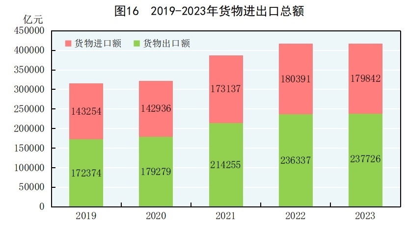 全年貨物進出口總額417568億元,比上年增長0.2%。其中,出口237726億元,增長0.6%;進口179842億元,下降0.3%。貨物進出口順差57883億元,比上年增加1938億元。對共建“一帶一路”[46]國家進出口額194719億元,比上年增長2.8%。其中,出口107314億元,增長6.9%;進口87405億元,下降1.9%。對《區(qū)域全面經(jīng)濟伙伴關(guān)系協(xié)定》(RCEP)其他成員國[47]進出口額125967億元,比上年下降1.6%。民營企業(yè)進出口額223601億元,比上年增長6.3%,占進出口總額比重為53.5%。