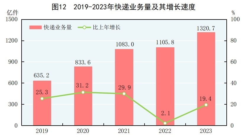 全年完成郵政行業(yè)寄遞業(yè)務(wù)總量[29]1625億件,比上年增長16.8%。郵政業(yè)完成郵政函件業(yè)務(wù)9.7億件,包裹業(yè)務(wù)0.2億件,快遞業(yè)務(wù)量1320.7億件,快遞業(yè)務(wù)收入12074億元。全年完成電信業(yè)務(wù)總量[30]18327億元,比上年增長16.8%。年末移動電話基站數(shù)[31]1162萬個,其中4G基站629萬個,5G基站338萬個。全國電話用戶總數(shù)189992萬戶,其中移動電話用戶172660萬戶。移動電話普及率為122.5部/百人。固定互聯(lián)網(wǎng)寬帶接入用戶[32]63631萬戶,比上年末增加4666萬戶,其中100M速率及以上的寬帶接入用戶[33]60136萬戶,增加4756萬戶。蜂窩物聯(lián)網(wǎng)終端用戶[34]23.32億戶,增加4.88億戶?;ヂ?lián)網(wǎng)上網(wǎng)人數(shù)10.92億人,其中手機上網(wǎng)人數(shù)10.91億人。互聯(lián)網(wǎng)普及率為77.5%,其中農(nóng)村地區(qū)互聯(lián)網(wǎng)普及率為66.5%。全年移動互聯(lián)網(wǎng)用戶接入流量3015億GB,比上年增長15.2%。軟件和信息技術(shù)服務(wù)業(yè)[35]完成軟件業(yè)務(wù)收入123258億元,比上年增長13.4%。