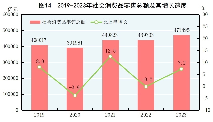 全年社會消費品零售總額471495億元,比上年增長7.2%。按經(jīng)營地分,城鎮(zhèn)消費品零售額407490億元,增長7.1%;鄉(xiāng)村消費品零售額64005億元,增長8.0%。按消費類型分,商品零售額418605億元,增長5.8%;餐飲收入52890億元,增長20.4%。服務(wù)零售額[36]比上年增長20.0%。