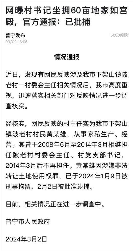 ·廣東普寧通報村支書坐擁60畝地:黃某雄因涉嫌非法轉讓土地使用權罪已被批準逮捕。