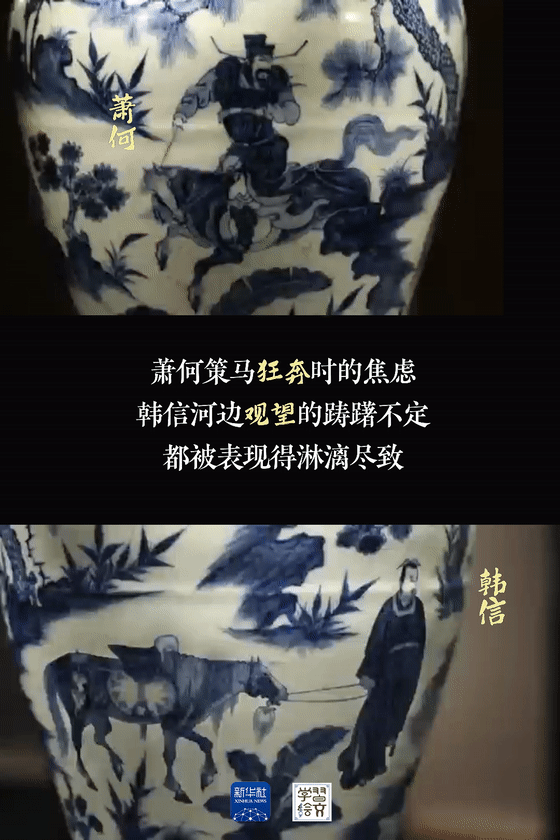 “元代是中國(guó)陶瓷史上不容忽視的重要時(shí)期?!彼窝嘟榻B,這件藏于南京市博物館的元青花蕭何月下追韓信圖梅瓶向人們展示了元代制瓷水平。