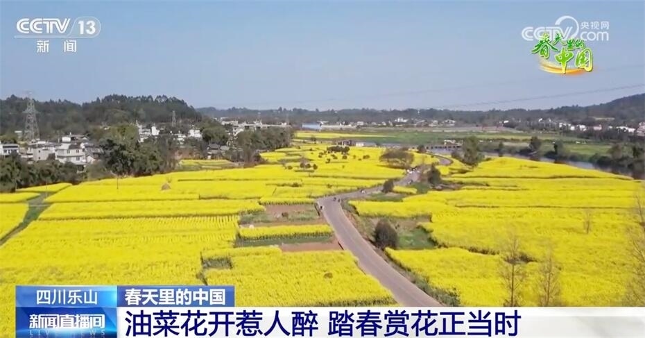 遠眺峨眉山,近看峨眉河,萬頃金波花如海,流金溢彩百里香。現(xiàn)在我們看到的是四川樂山市中區(qū) 永和村的近千畝油菜花,在陽光照射下,猶如斑斕的綢帶,妝點了峨眉河沿岸五彩的山色春光。趁著晴好天氣,市民、游客來到戶外踏青賞景,在花田中徜徉流連,感受春日美好時光。