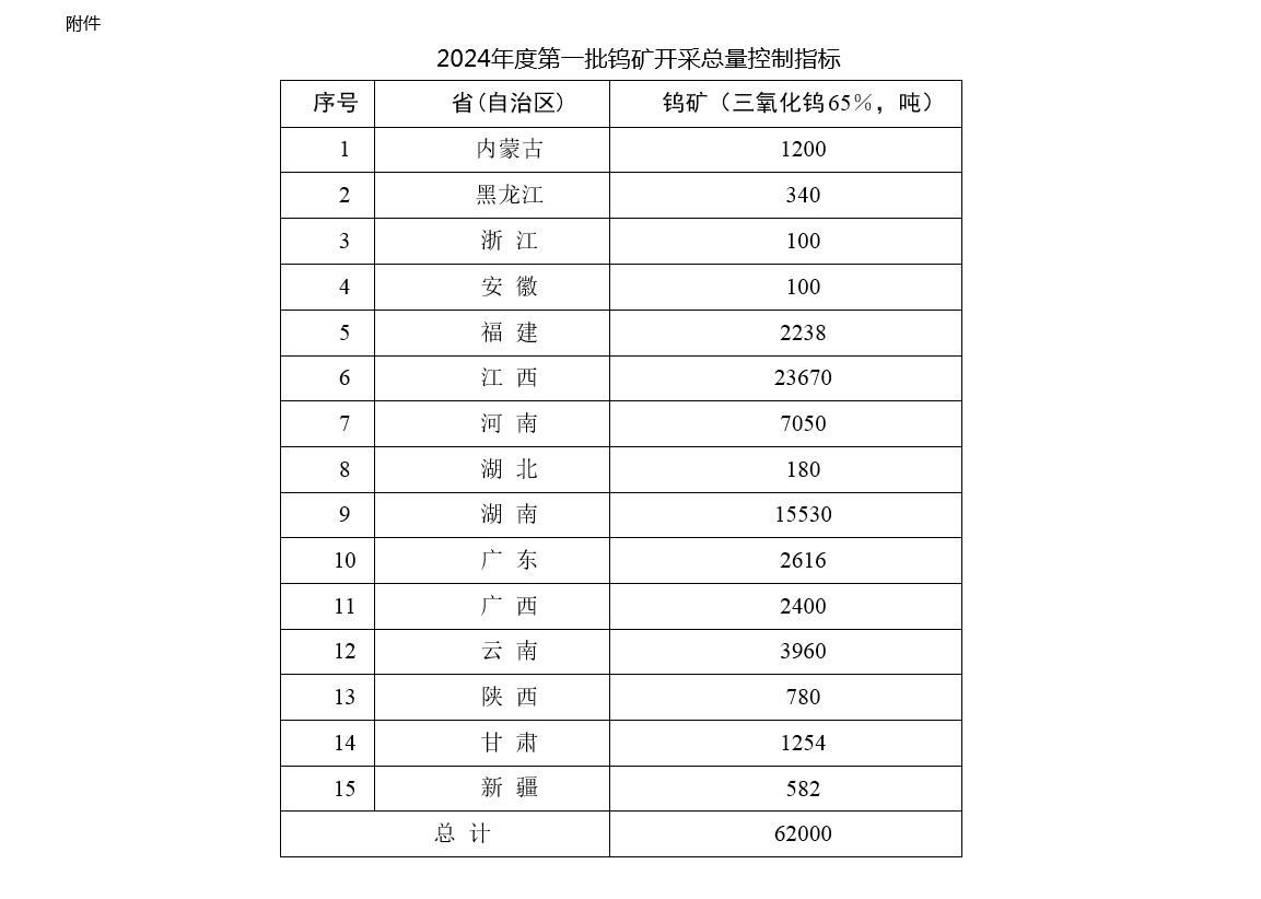 央視網(wǎng)消息:據(jù)自然資源部消息,自然資源部發(fā)布關(guān)于下達(dá)2024年度鎢礦開采總量控制指標(biāo)(第一批)的通知,2024年度第一批鎢礦(三氧化鎢含量65%,下同)開采總量控制指標(biāo)62000噸。鎢礦開采總量控制指標(biāo)不再區(qū)分主采指標(biāo)和綜合利用指標(biāo)。對采礦許可證登記開采主礦種為其他礦種、共伴生鎢礦的礦山,查明鎢資源量為大中型的,繼續(xù)下達(dá)開采總量控制指標(biāo),并在分配上予以傾斜。對共伴生鎢資源量為小型的,不再下達(dá)開采總量控制指標(biāo),由礦山企業(yè)向所在地省級自然資源主管部門報(bào)備鎢礦產(chǎn)量。具體如下: