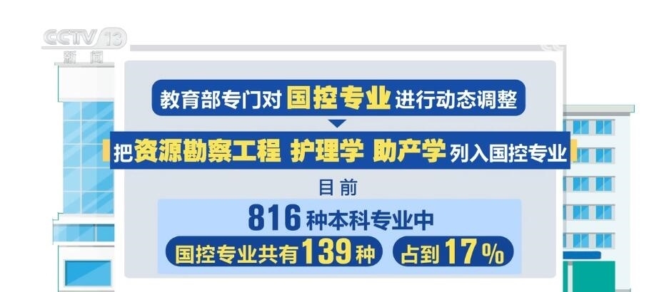 此次教育部專門對國控專業(yè)進行了動態(tài)調(diào)整,把資源勘察工程、護理學(xué)、助產(chǎn)學(xué)列入了國控專業(yè)。目前,816種本科專業(yè)中,國控專業(yè)共有139種,占到17%。未來,國控專業(yè)范圍還將進行“有進有出”的動態(tài)調(diào)整。