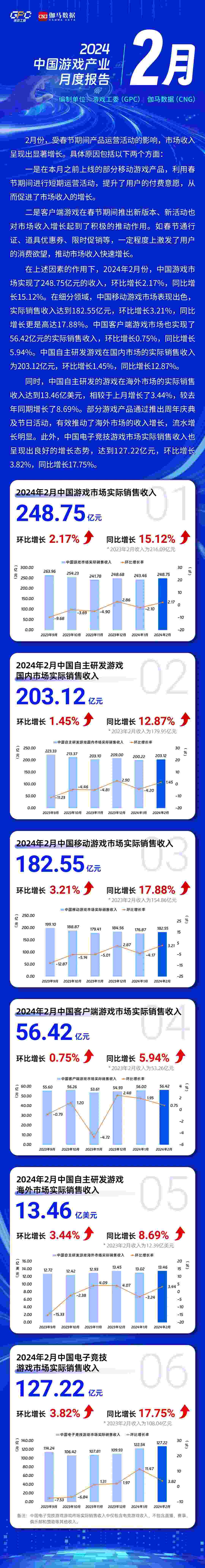 央視網(wǎng)消息:3月20日,據(jù)中國音數(shù)協(xié)游戲工委官微消息,2024年2月中國游戲產(chǎn)業(yè)月度報(bào)告發(fā)布。報(bào)告顯示,2024年2月份,中國游戲市場(chǎng)實(shí)現(xiàn)了248.75億元的收入,環(huán)比增長2.17%,同比增長15.12%。在細(xì)分領(lǐng)域,中國移動(dòng)游戲市場(chǎng)表現(xiàn)出色,實(shí)際銷售收入達(dá)到182.55億元,環(huán)比增長3.21%,同比增長更是高達(dá)17.88%。中國客戶端游戲市場(chǎng)也實(shí)現(xiàn)了56.42億元的實(shí)際銷售收入,環(huán)比增長0.75%,同比增長5.94%。中國自主研發(fā)游戲在國內(nèi)市場(chǎng)的實(shí)際銷售收入為203.12億元,環(huán)比增長1.45%,同比增長12.87%。