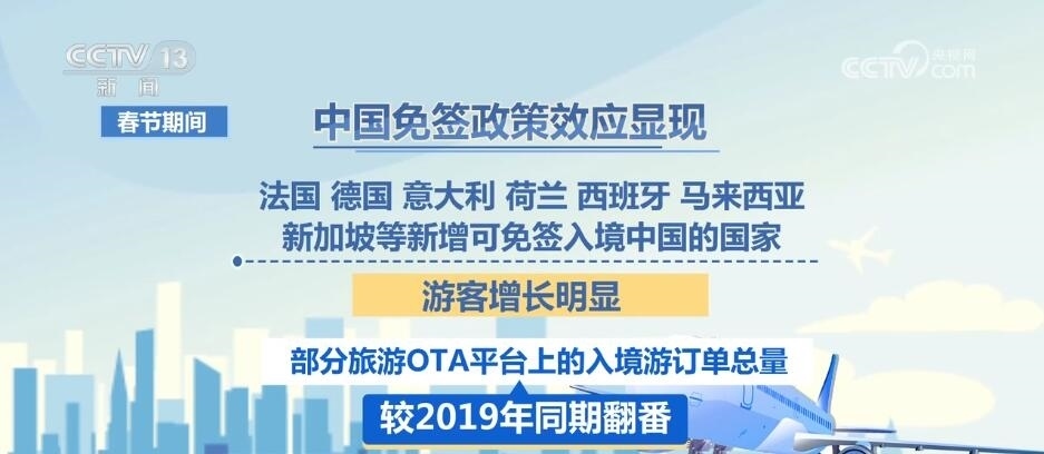 根據(jù)國家移民局統(tǒng)計(jì)數(shù)據(jù),2024年1月至2月,外籍人員入出境共計(jì)294.5萬人次,環(huán)比增長2.3倍,恢復(fù)至疫情前的41.5%。春節(jié)期間,中國免簽政策效應(yīng)顯現(xiàn),法國、德國、意大利、荷蘭、西班牙、馬來西亞、新加坡等新增可免簽入境中國的國家,游客增長明顯,部分旅游OTA平臺(tái)上的入境游訂單總量較2019年同期翻番。