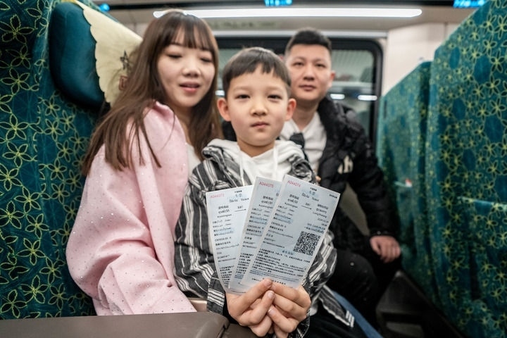 ?在云南昆明,乘坐中老鐵路國(guó)際旅客列車前往老撾的游客展示購買到的車票(2024年2月14日攝)。