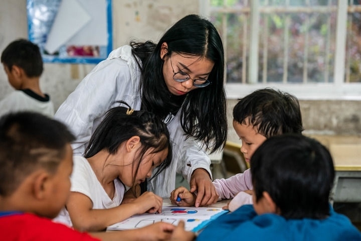 ?在云南省文山州文山市馬塘鎮(zhèn)新開田村委會(huì)新開田一隊(duì),志愿者楊紅非在“少年兒童之家”教孩子們繪畫(2022年8月9日攝)。