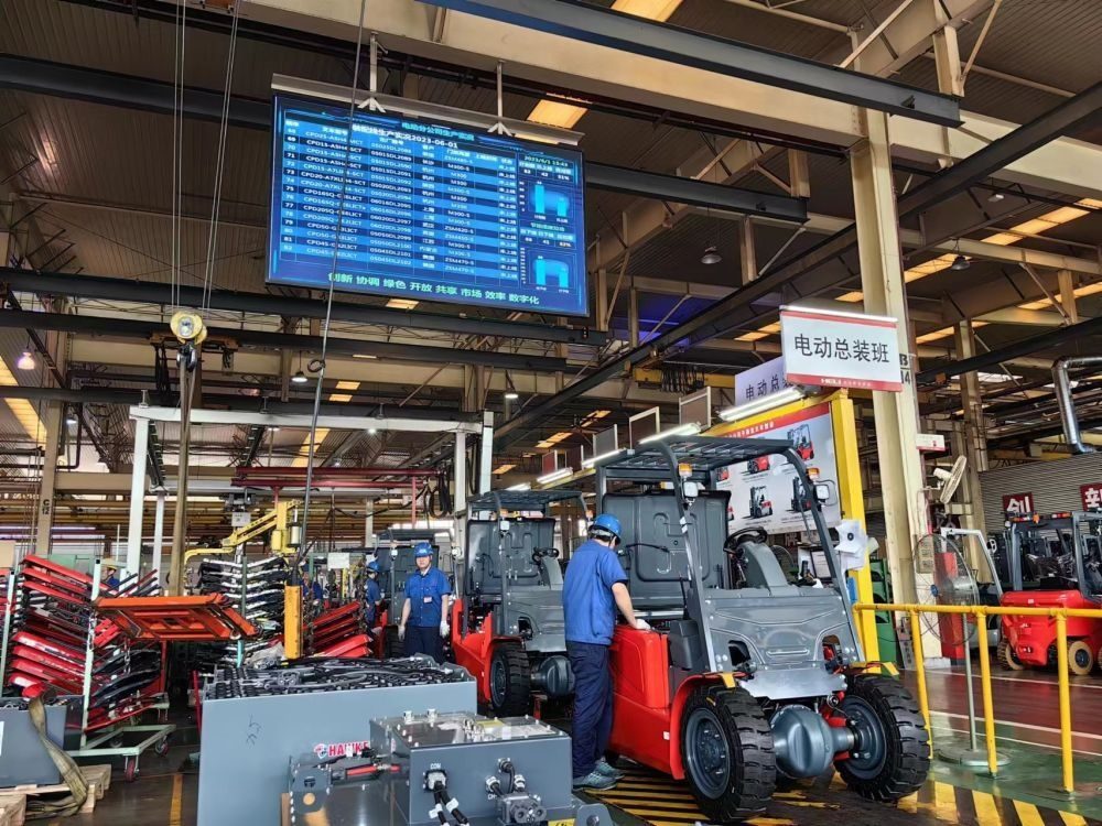 在安徽合力股份有限公司的生產(chǎn)車間,工人們?cè)谏a(chǎn)銷往RCEP成員國(guó)的叉車(2023年6月1日攝)。新華社記者 汪海月 攝