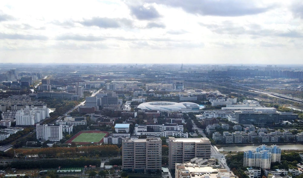 空中遠(yuǎn)望位于上海浦東新區(qū)張江科學(xué)城的形如鸚鵡螺的大科學(xué)裝置上海光源(中)(2023年11月25日攝,無(wú)人機(jī)照片)。新華社記者 方喆 攝