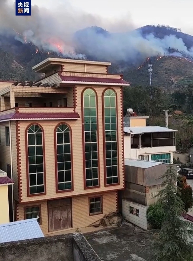 當(dāng)?shù)鼐用癖硎撅L(fēng)勢較大,火勢正向村莊方向蔓延,距離民房還有一定距離,明火和煙霧清晰可見。
