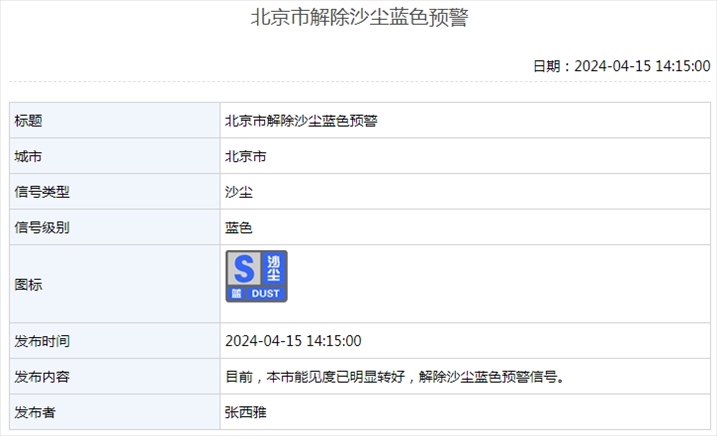 4月15日14時(shí)15分,北京市解除沙塵藍(lán)色預(yù)警:目前,本市能見度已明顯轉(zhuǎn)好,解除沙塵藍(lán)色預(yù)警信號。