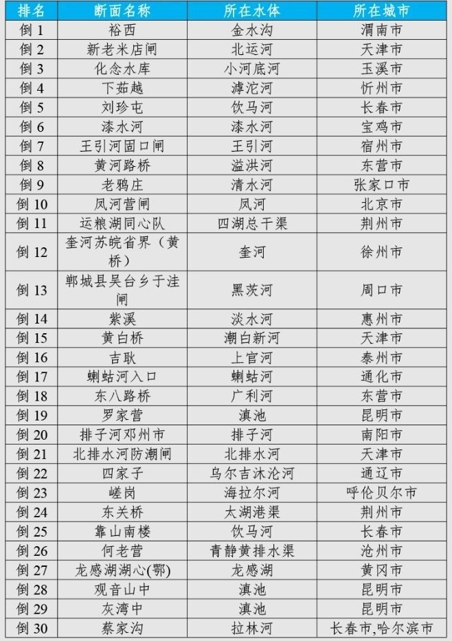 咸陽市泔河入涇河、朝陽市大凌河西支入河口和綏化市/黑河市通肯河大橋等30個國家地表水考核斷面水環(huán)境質量變化情況相對較好(從第1名至第30名),渭南市裕西、天津市新老米店閘和玉溪市化念水庫等30個國家地表水考核斷面水環(huán)境質量變化情況相對較差(從倒數(shù)第1名至倒數(shù)第30名)。