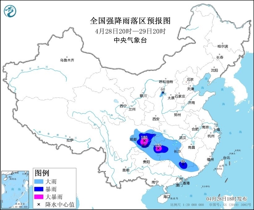 預(yù)計(jì),4月28日20時(shí)至29日20時(shí),湖北西南部、湖南大部、江西南部、四川盆地中東部、重慶大部、貴州東部、廣東北部等地部分地區(qū)有大到暴雨,其中,湖南西部、四川盆地東部、重慶東南部和西南部、貴州東北部等地部分地區(qū)有大暴雨(100~160毫米)。上述部分地區(qū)伴有短時(shí)強(qiáng)降水(最大小時(shí)降雨量30~60毫米,局地可超過80毫米),局地有雷暴大風(fēng)或冰雹等強(qiáng)對(duì)流天氣。