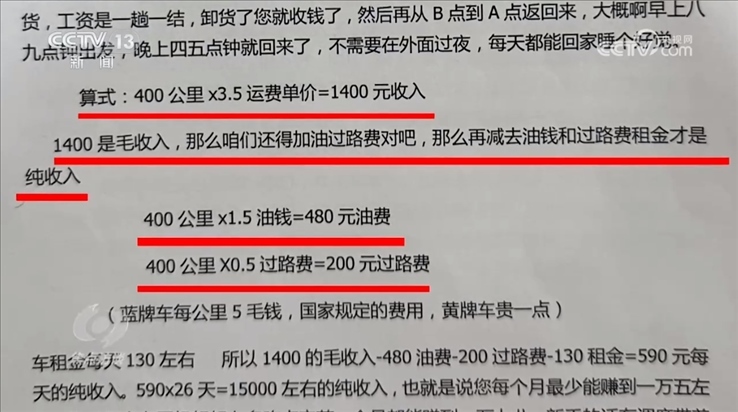 這些人開物流公司只不過是因為假借物流公司的名義更容易騙到錢而已。他們靠著誘人的招聘條件吸引司機(jī)到線下面試,等有人來了,面試經(jīng)理就會盡力表演。這是一份所謂物流公司的話術(shù)本,在面試環(huán)節(jié),上面寫著:上來要微笑詢問、簡單贊賞、拉近距離。在司機(jī)最在意的收入問題上,話術(shù)中提醒:要重點講活、細(xì)算收入、多舉例子。再看這收入計算公式,確實很詳盡。