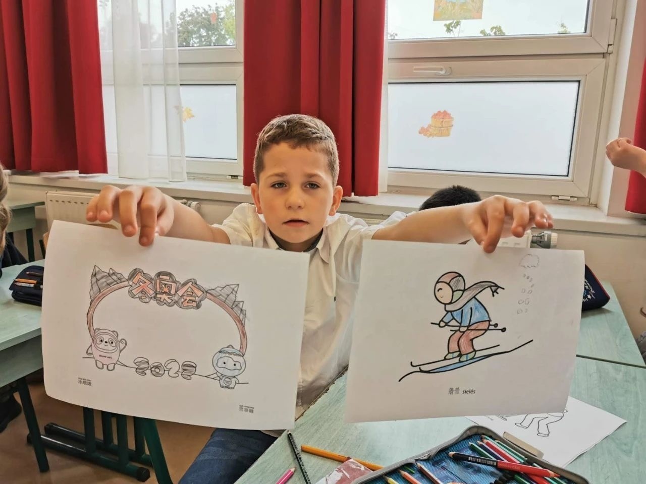 △匈中雙語(yǔ)學(xué)校學(xué)生展示具有冬奧元素的填圖畫(huà) 。