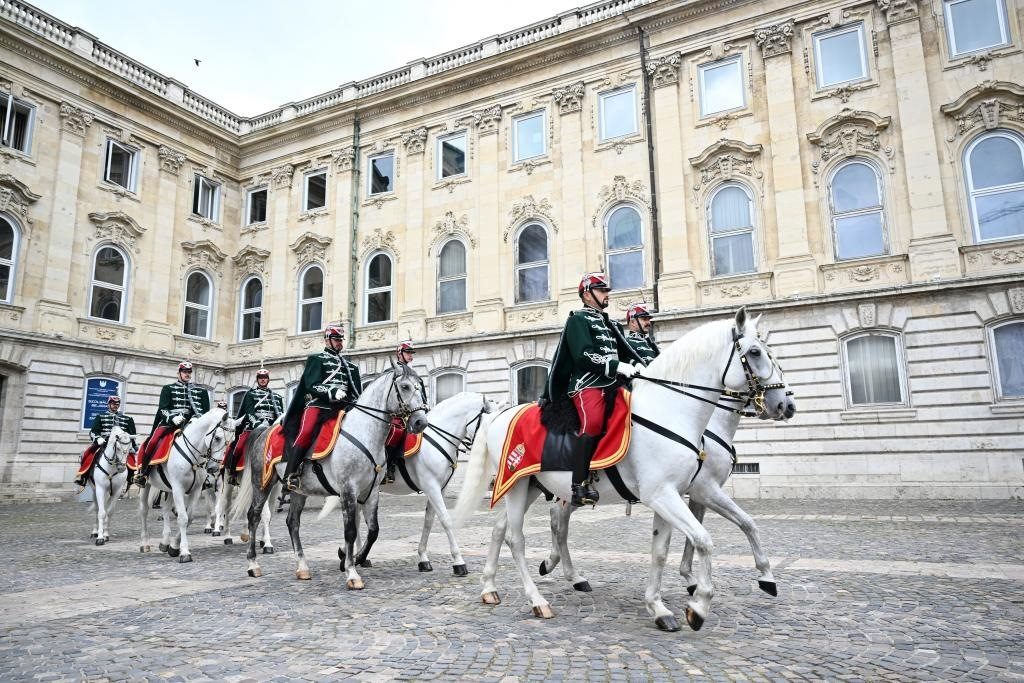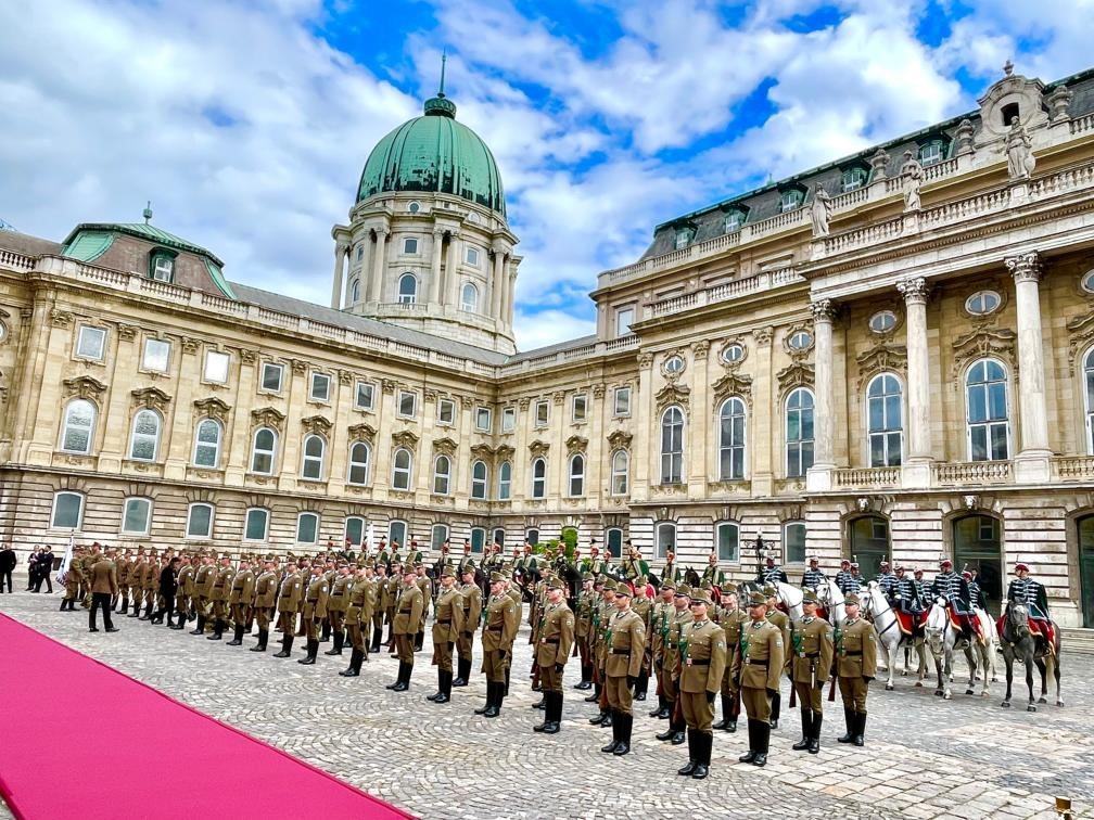 初夏時(shí)節(jié)的布達(dá)佩斯陽(yáng)光明媚,古老宏偉的布達(dá)王宮莊嚴(yán)矗立,中匈兩國(guó)國(guó)旗相映成輝。習(xí)近平和夫人彭麗媛乘坐的國(guó)賓車隊(duì)在匈牙利禮賓馬隊(duì)護(hù)衛(wèi)下緩緩駛?cè)氩歼_(dá)王宮內(nèi)庭。舒尤克總統(tǒng)夫婦和歐爾班總理夫婦熱情迎接。