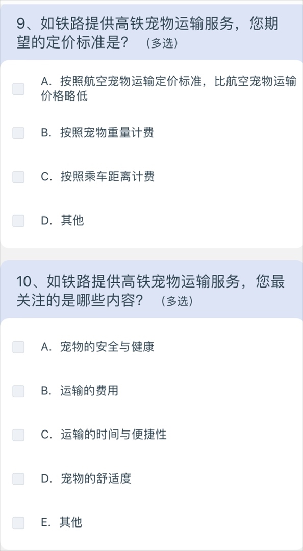 5月10日上午8點(diǎn)40分,澎湃新聞?dòng)浾咄ㄟ^掃描網(wǎng)友分享的列車上的二維碼,進(jìn)入12306系統(tǒng),選擇問卷·建議,進(jìn)入“鐵路旅客高鐵寵物運(yùn)輸”調(diào)查,共15個(gè)問題,涉及養(yǎng)寵類型、是否有攜帶寵物出行的需求、如果鐵路提供寵物運(yùn)輸服務(wù)是否愿意嘗試等,以及為降低對(duì)其他旅客的影響,在高鐵寵物運(yùn)輸更關(guān)注哪方面的防護(hù);如鐵路提供高鐵寵物運(yùn)輸服務(wù),期望的定價(jià)標(biāo)準(zhǔn);如鐵路提供高鐵寵物運(yùn)輸服務(wù),最關(guān)注的內(nèi)容;如果是非養(yǎng)寵人士,對(duì)高鐵寵物運(yùn)輸有何建議等多方面問題。