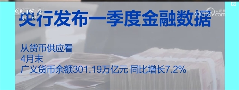 央行數(shù)據(jù)顯示,從貨幣供應(yīng)看,4月末,廣義貨幣余額301.19萬(wàn)億元,同比增長(zhǎng)7.2%。
