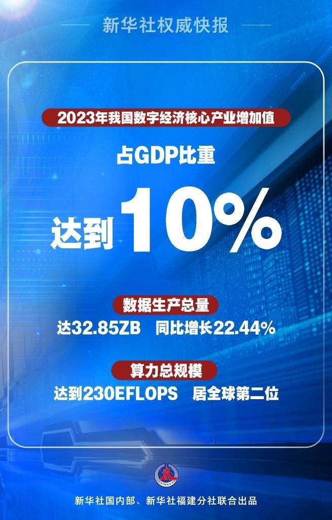 2023年我國數(shù)字經濟保持穩(wěn)健增長,數(shù)字經濟核心產業(yè)增加值占GDP比重達到10%。數(shù)據要素市場日趨活躍,2023年數(shù)據生產總量達32.85ZB(1個ZB等于十萬億億字節(jié)),同比增長22.44%。數(shù)字基礎設施不斷擴容提速,算力總規(guī)模達到230EFLOPS(EFLOPS是指每秒百億億次浮點運算次數(shù)),居全球第二位。