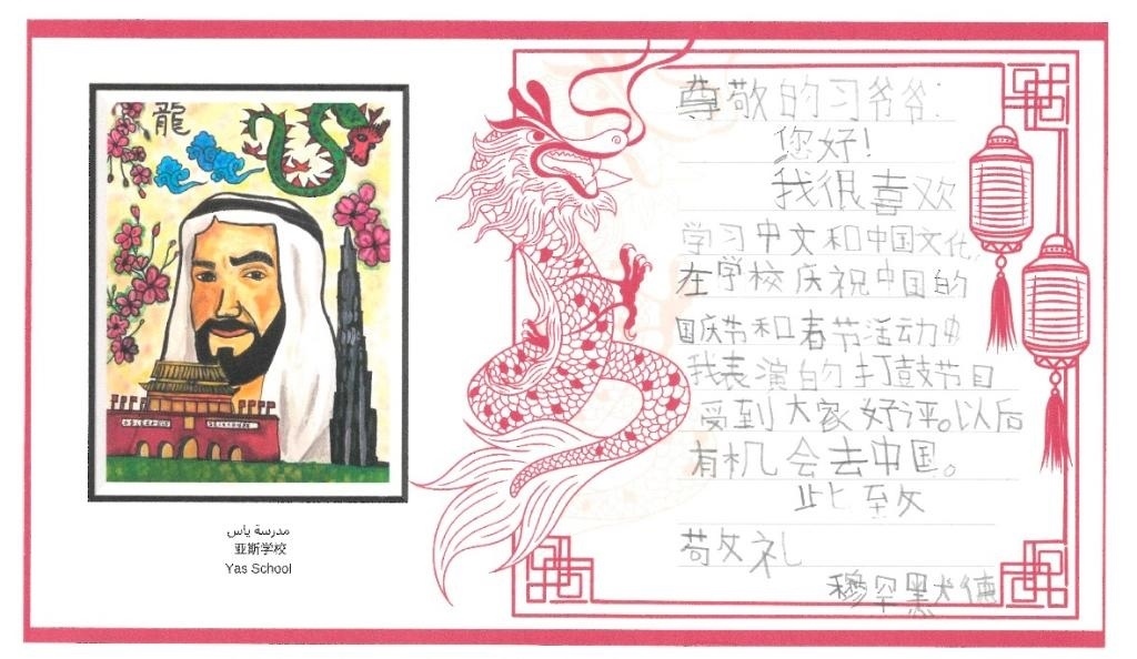今年是中國同阿聯(lián)酋建交40周年。“百校項(xiàng)目”已正式啟動(dòng)實(shí)施5年。日前,阿聯(lián)酋“百校項(xiàng)目”示范校哈姆丹·本·扎耶德學(xué)校(簡稱哈姆丹學(xué)校)和亞斯學(xué)校40名中小學(xué)生代表分別用中文致信習(xí)近平主席,表達(dá)對中國文化的向往和熱愛,立志做阿中友好的使者。