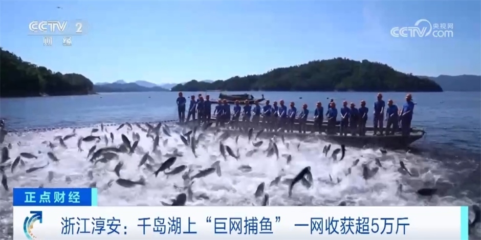 浙江淳安:千島湖上“巨網(wǎng)捕魚” 一網(wǎng)收獲超5萬斤