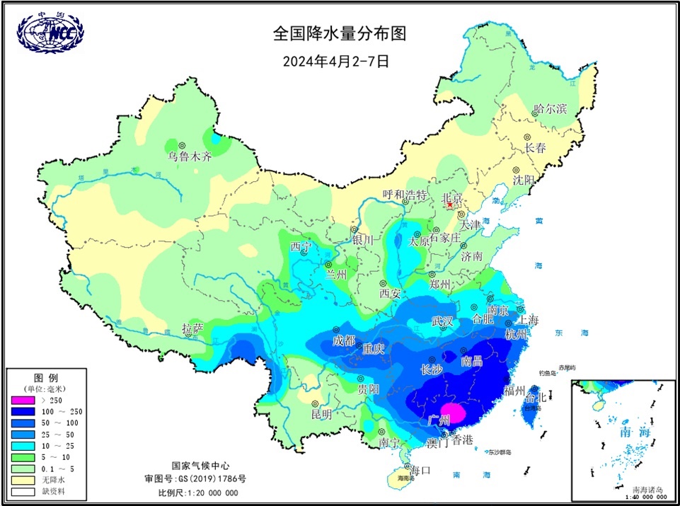 14次區(qū)域暴雨過程襲擊我國,較常年同期明顯偏多。春季,我國共發(fā)生14次區(qū)域暴雨過程,較常年同期偏多3.8次。4月2-7日的暴雨過程為1961年以來同期第八強,受其影響,我國華東南部、華中南部、華南東部及貴州東北部、重慶、四川中東部等地累計降水量50~100毫米,浙江西南部、福建、江西南部、湖南東南部、廣東大部等地累計降水量100~250毫米,局地超過250毫米(圖5);湖南茶陵(203.2毫米)、廣東始興(145.3毫米)日降水量超過極端閾值。
