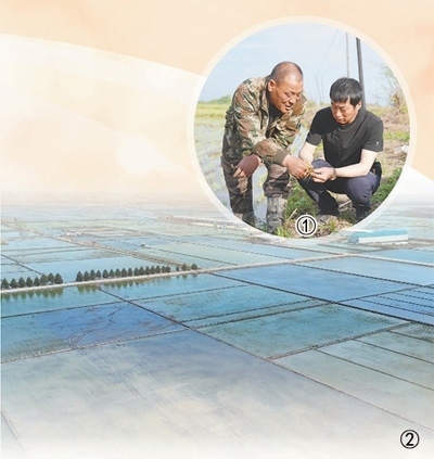 圖①:于海河(右)在田間地頭和村民一起查看水稻長勢(shì)。 本報(bào)記者 方 圓攝圖②:完成了機(jī)械化插秧的水稻田。虎林市委宣傳部供圖