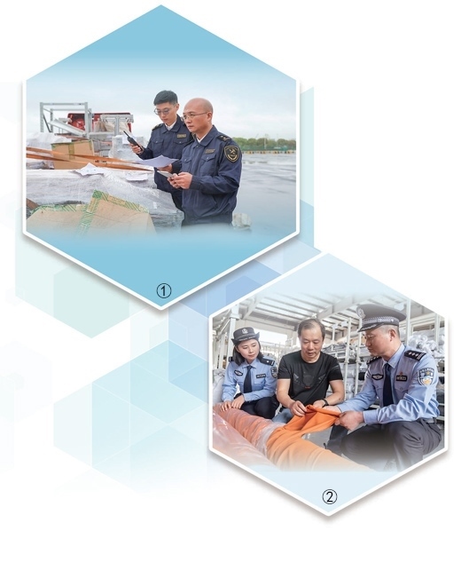 圖①:上海海關所屬松江海關工作人員檢查貨物。上海海關致力打造通關手續(xù)更簡便、通關效率更快捷、監(jiān)管更嚴密有效的營商環(huán)境。姜輝輝攝(人民視覺) 圖②:江蘇南通通州區(qū)公安局西亭派出所民警走進生產(chǎn)車間,了解企業(yè)情況,護航企業(yè)經(jīng)營發(fā)展。翟慧勇攝(人民視覺)